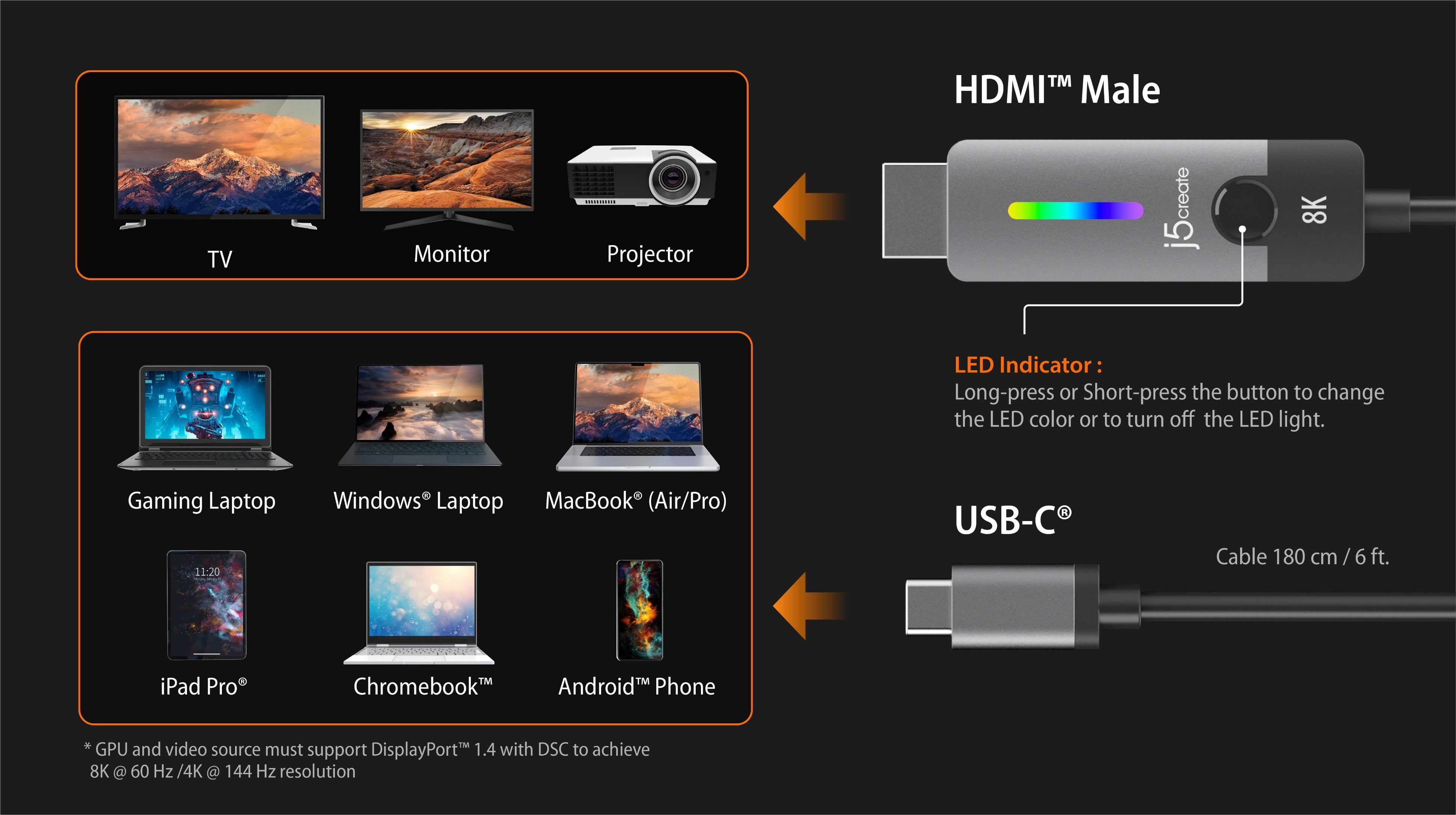 Кабель USB-C® до HDMI™ 2.1 8K дозволяє зручно підключити ігровий ноутбук, MacBook®, Chromebook™ або планшет до зовнішнього монітора 8K UHD / 4K 144Гц, 8K UHDTV, проектора та інших пристроїв відображення за допомогою входу HDMI™.